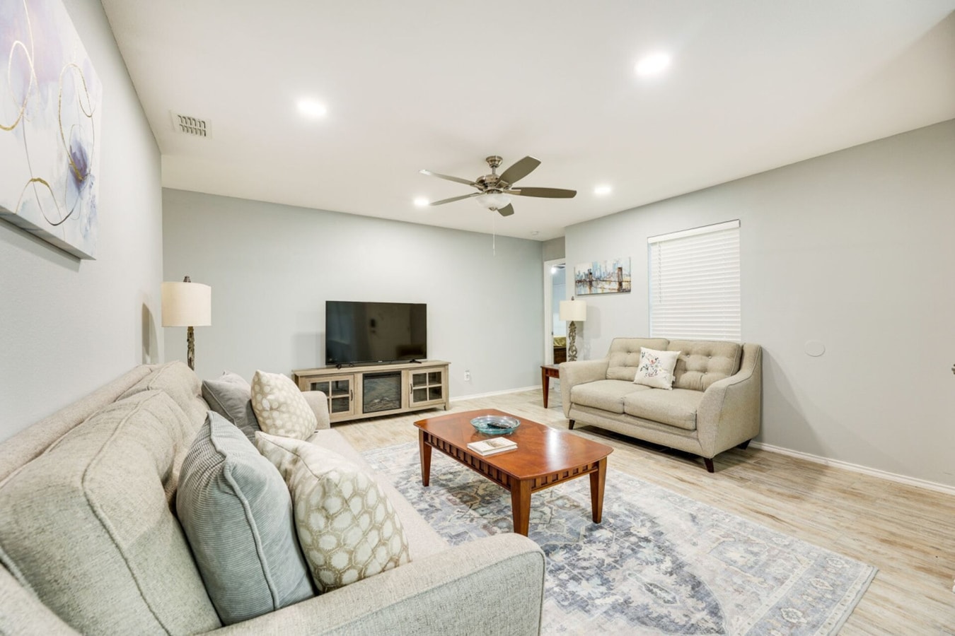 Memories are waiting to be made at this lovely 4-bedroom, 2-bathroom San Juan vacation rental, fit for a multi-generational family — pets included! This single-story house offers a well-stocked kitchen, in-unit laundry, 4 Smart TVs, and a private, fenced backyard. Learn about the historic La Lomita Mission, tour the Gelman Stained Glass Museum, experience classic Southern line-dancing at the Alamo Dance Hall, and cast your line at La Feria Reservoir.