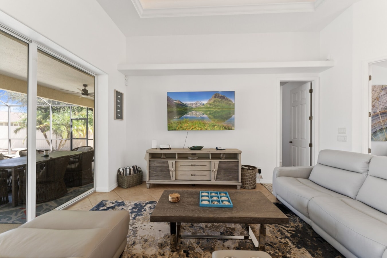 Step outside to a welcoming outdoor space that invites relaxation and leisure. Whether you're lounging by the pool or enjoying the fresh air in the screened lanai, this area offers the perfect spot to unwind and savor the peaceful surroundings.