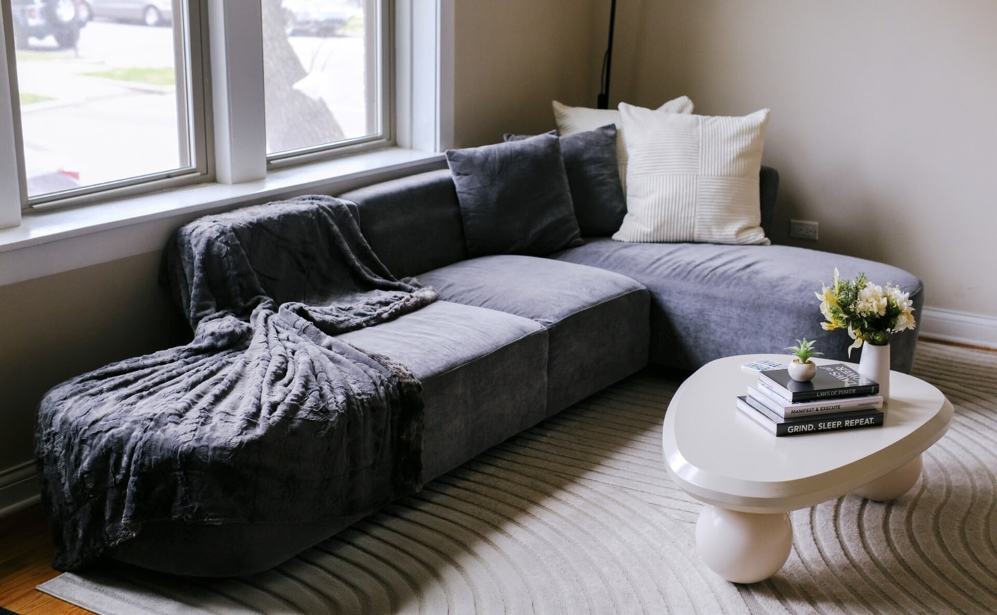 A modern, stylish space designed for relaxation and comfort, perfect for unwinding after a busy day.