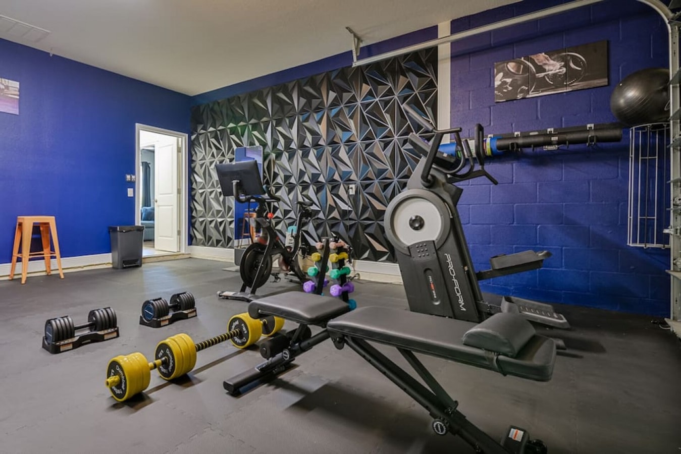 ▪️ Gym w/ Peloton Bike, Yoga Mats, Dumbbells, Weights, Bench + Yoga Balls