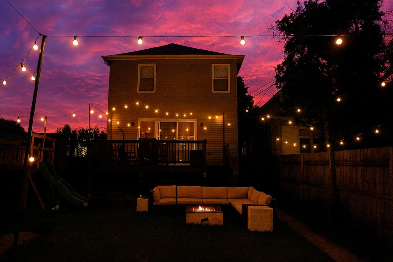 Offers a relaxed blend of play and peace—where kids can explore the playset, grownups can kick back on the deck, and everyone can enjoy time under the trees and string lights. Whether it's a sunny afternoon or a cozy evening outdoors, this space makes it easy to unwind and connect.