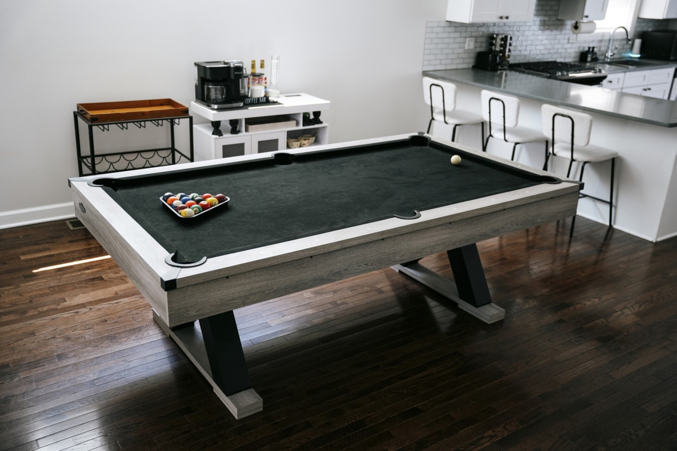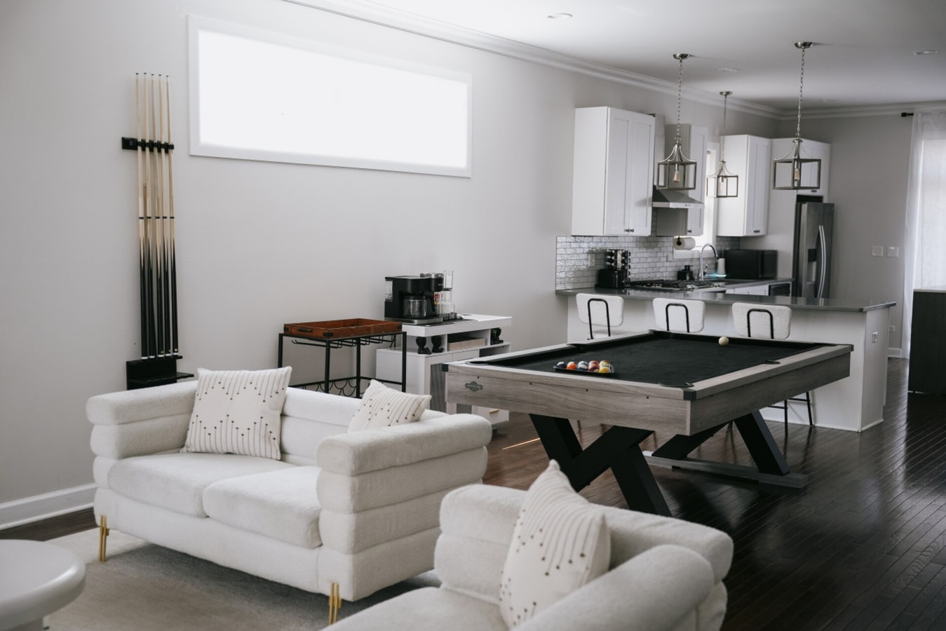 Centered around a sleek pool table and cozy seating, it’s designed for connection—whether it’s game night, morning coffee, or winding down by the fire.