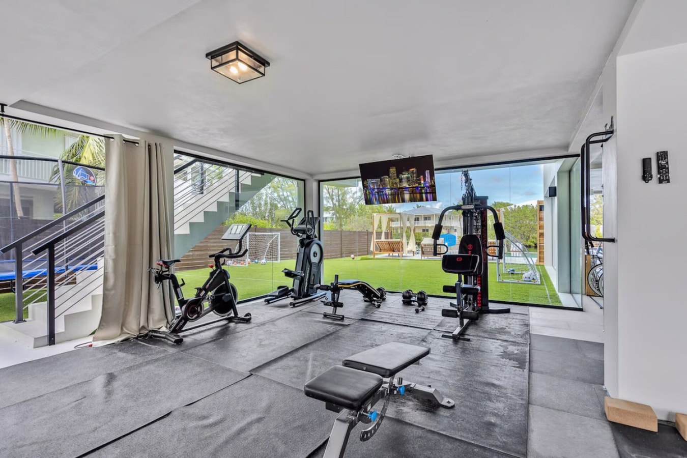 With floor-to-ceiling windows and views of the pool and canal, this open-air fitness space makes workouts feel anything but routine. Whether you're doing cardio on the bike, strength training on the all-in-one machine, or stretching out on the mats with your favorite fitness show playing on the wall-mounted TV, this gym offers the perfect mix of motivation and serenity.