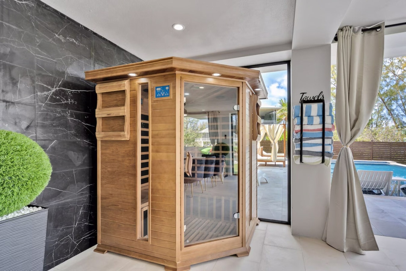 ✔️ Sauna (indoor-style, outdoor placement)