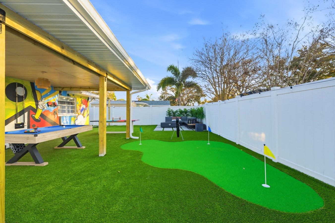 Step outside into your private oasis! Enjoy a refreshing swim in the year-round pool, unwind by the outdoor fireplace or fire pit, grill up a feast in the outdoor kitchen, or lounge in the sun-drenched backyard. The fully fenced garden is ideal for pets and little ones, and the miniature golf adds a playful touch for all ages.